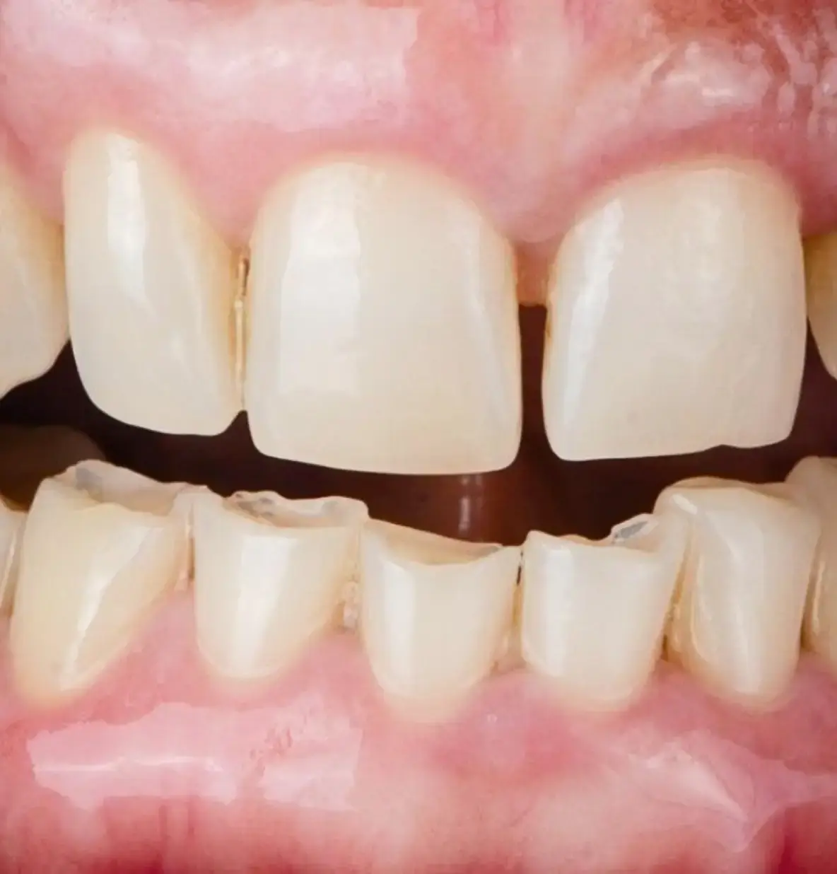 Прямой прикус способствует ускоренному стиранию эмали, приводящему к повышенной чувствительности зубов и образованию сколов. Это связано с чрезмерным контактом режущих краев верхних и нижних резцов при смыкании челюстей.
